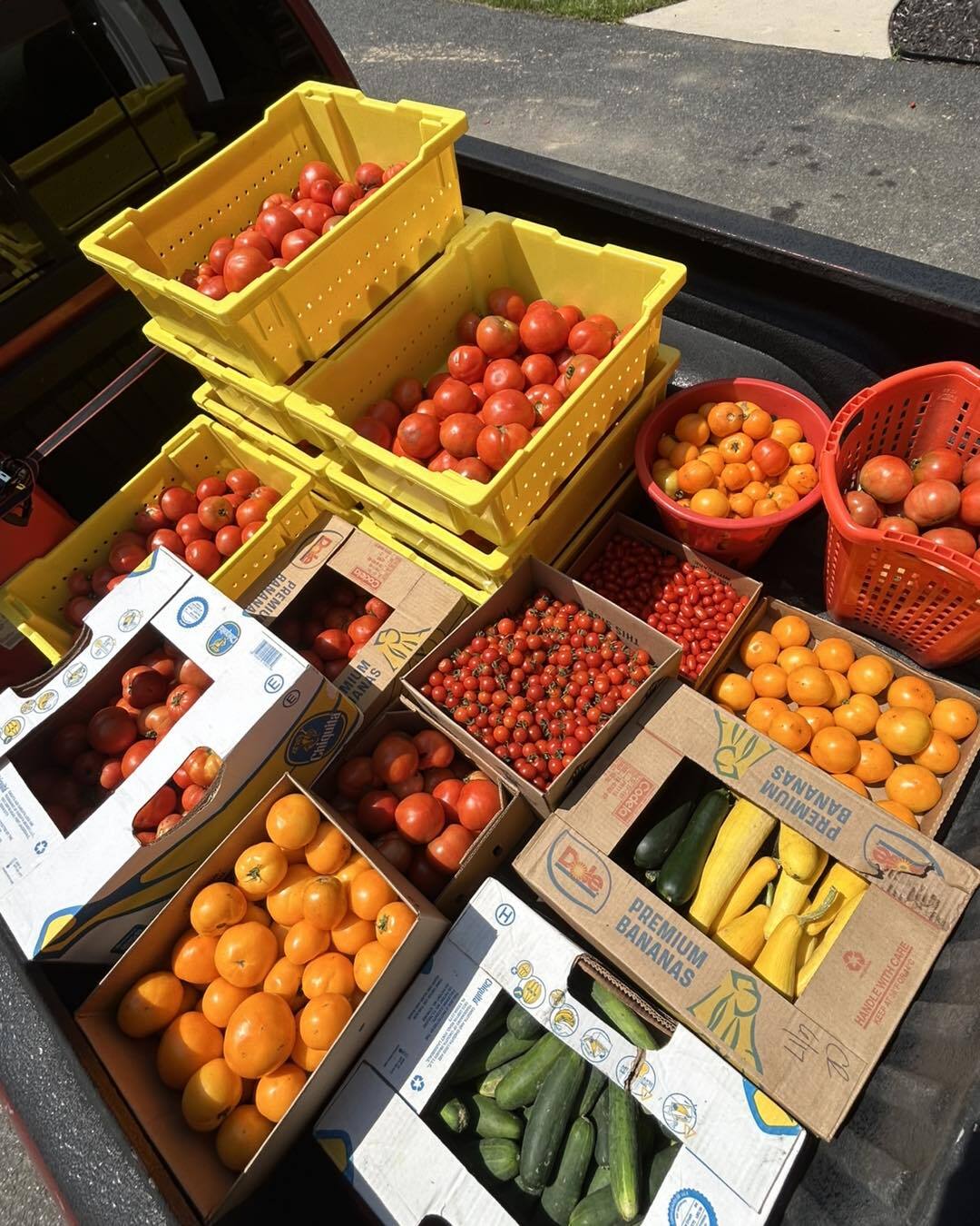 The produce delivered and shared was several types of tomatoes, cucumbers, yellow squash, zucchini, a variety of peppers, eggplant, and everyone's favorite... watermelon!